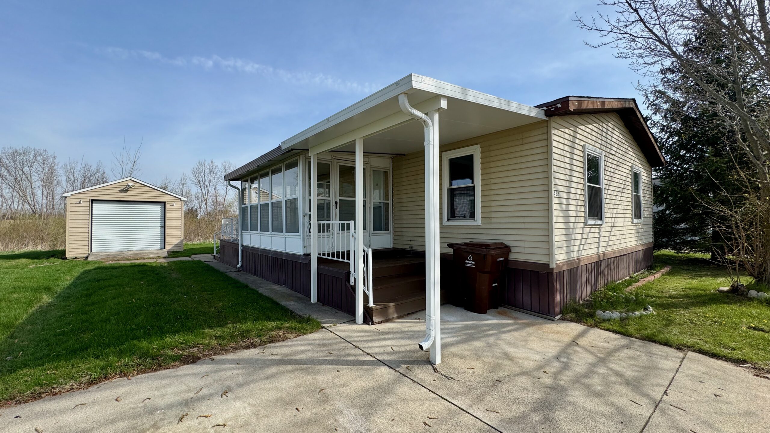 Enjoy the natural light year-round in the 7×14 sunroom, ideal for a reading nook, hobby space, or simply relaxing with a view of the outdoors. A large awning covers the entry steps, providing shelter and curb appeal. Storage will never be an issue thanks to the large shed with a convenient roll-up door, perfect for tools, bikes, or even a small workshop setup.