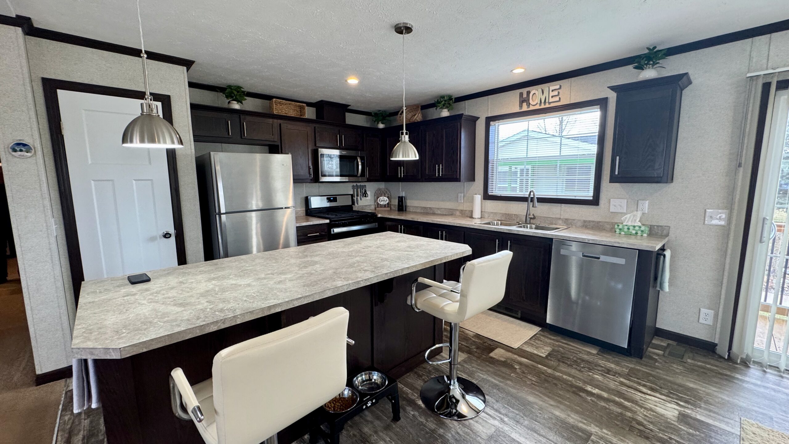 Step inside to a bright open-concept floorplan featuring a stylish island kitchen complete with full stainless steel appliances and trendy stainless pendant lighting above the island, with seating for three—perfect for casual dining or entertaining. The home also includes a formal dining area with a sliding glass door, bringing in plenty of natural light and easy access to outdoor living.
