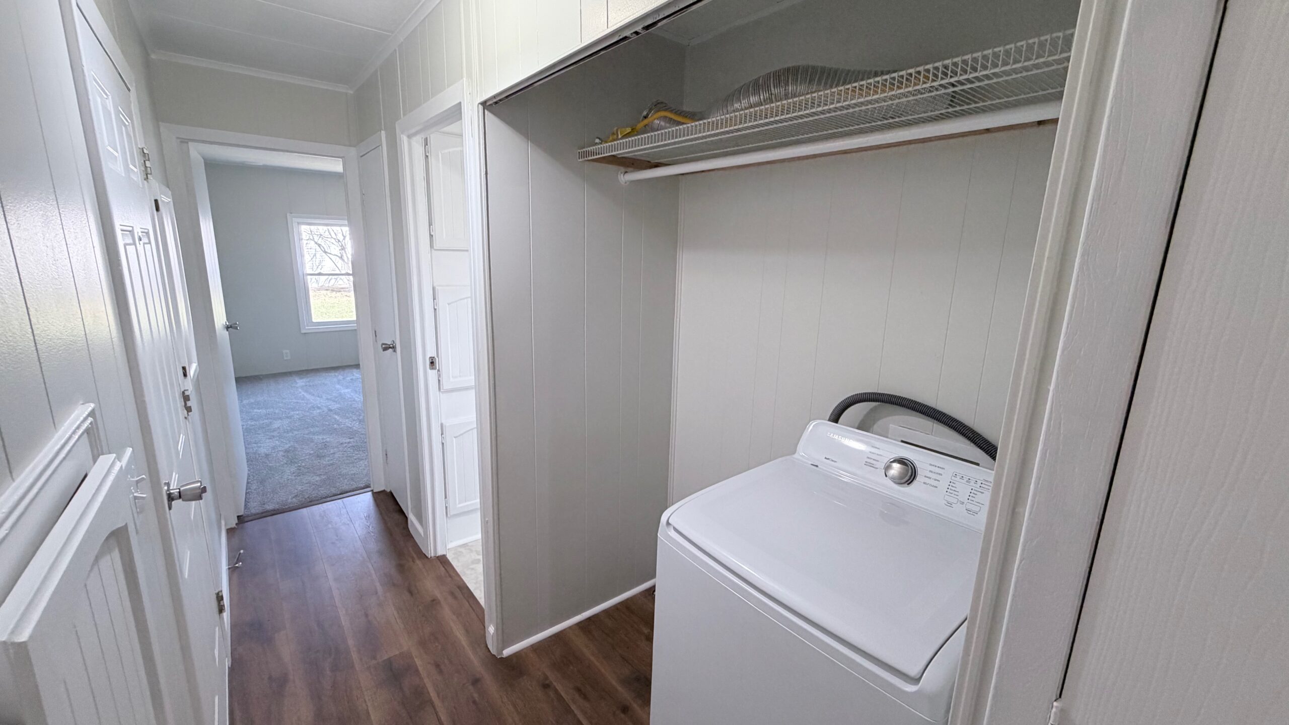 The renovation includes new cabinetry, updated countertops, new flooring throughout, fresh drywall and paint, and a new vanity in the common bathroom. Originally a 3-bedroom home, one bedroom was converted into a dedicated laundry room, adding everyday convenience and functionality.
